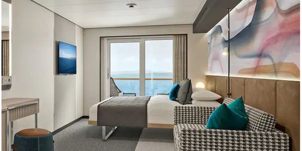 Private balcony with chairs and a table.| Two twin beds that convert to Royal King.| One sofa bed | Full bathroom& Shower
